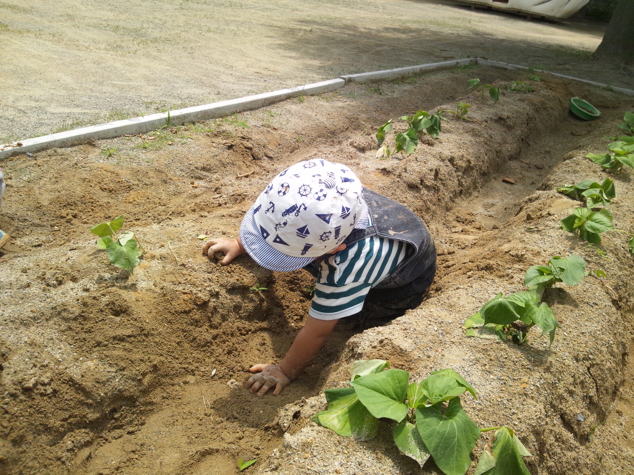 『いろいろじゃがいも』の絵本を見てから、園庭へ行って収穫しました。