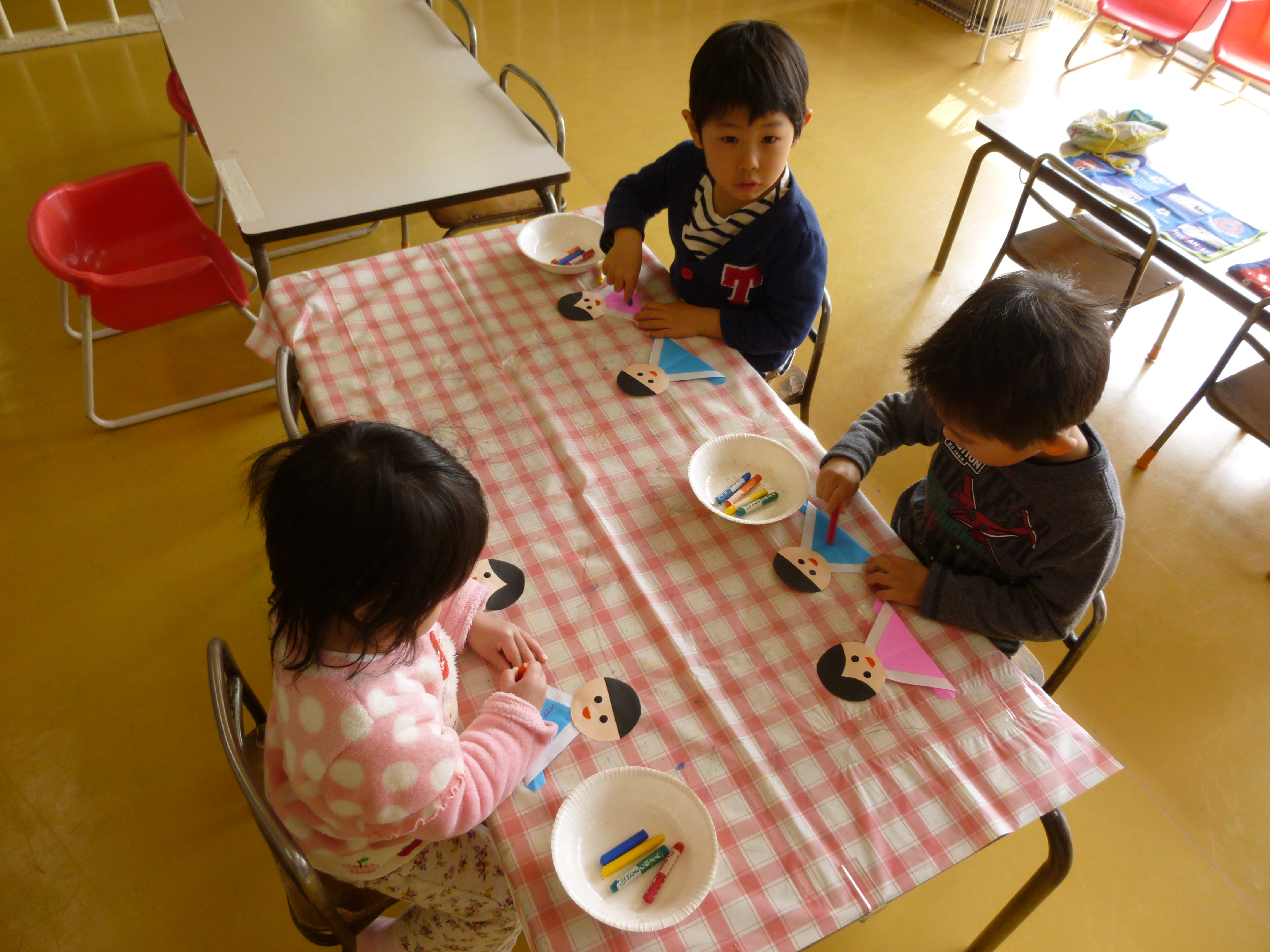 すみれグループの子はのりを使って、ほしグループの子は両面テープの紙をはがして貼りました。